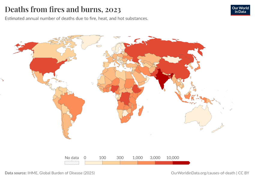 “Data Page: Deaths from fires and burns”, part of the following publication: Esteban Ortiz-Ospina and Max Roser (2016) - “Global Health”. Data adapted from IHME, Global Burden of Disease. Retrieved from https://data-populationgrowth-discre.owid.pages.dev:8789/20260211-174736/grapher/deaths-from-fires-and-burns.html [online resource] (archived on February 11, 2026).How to cite this data