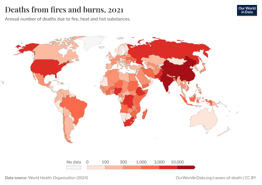 “Data Page: Deaths from fires and burns”, part of the following publication: Esteban Ortiz-Ospina and Max Roser (2016) - “Global Health”. Data adapted from World Health Organization. Retrieved from https://data-populationgrowth-discre.owid.pages.dev:8789/20250909-093708/grapher/deaths-from-fires-and-burns-who.html [online resource] (archived on September 9, 2025).How to cite this data