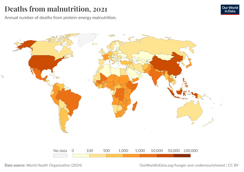 World Health Organization (2024) – with major processing by Our World in Data. “Deaths from malnutrition” [dataset]. World Health Organization, “Global Health Estimates” [original data]. Retrieved February 27, 2026 from https://data-populationgrowth-discre.owid.pages.dev:8789/20250909-093708/grapher/deaths-from-malnutrition-ghe.html (archived on September 9, 2025).