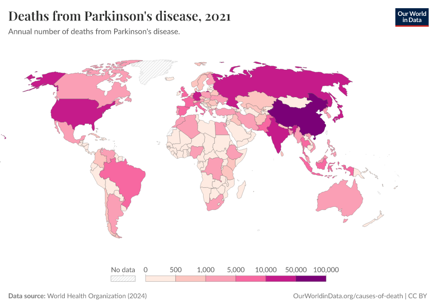 World Health Organization (2024) – with major processing by Our World in Data. “Deaths from Parkinson's disease” [dataset]. World Health Organization, “Global Health Estimates” [original data]. Retrieved February 27, 2026 from https://data-populationgrowth-discre.owid.pages.dev:8789/20250909-093708/grapher/deaths-from-parkinsons-disease-ghe.html (archived on September 9, 2025).