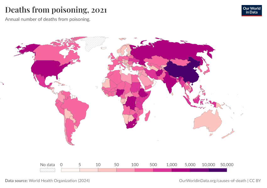 World Health Organization (2024) – with major processing by Our World in Data. “Deaths from poisoning” [dataset]. World Health Organization, “Global Health Estimates” [original data]. Retrieved February 27, 2026 from https://data-populationgrowth-discre.owid.pages.dev:8789/20250909-093708/grapher/deaths-from-poisonings-ghe.html (archived on September 9, 2025).