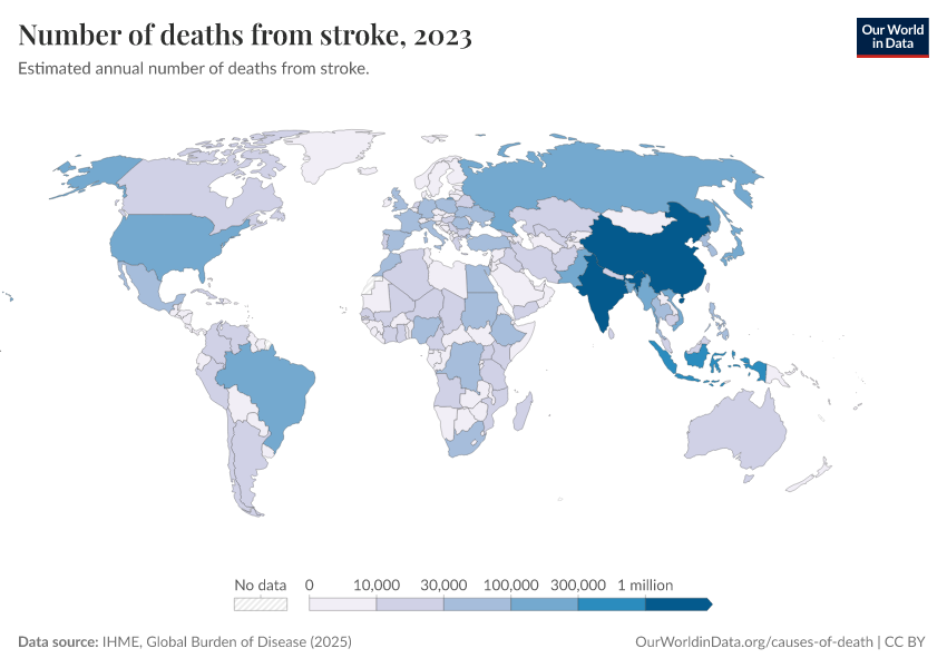 “Data Page: Number of deaths from stroke”, part of the following publication: Esteban Ortiz-Ospina and Max Roser (2016) - “Global Health”. Data adapted from IHME, Global Burden of Disease. Retrieved from https://data-populationgrowth-discre.owid.pages.dev:8789/20260211-174736/grapher/deaths-from-strokes.html [online resource] (archived on February 11, 2026).How to cite this data