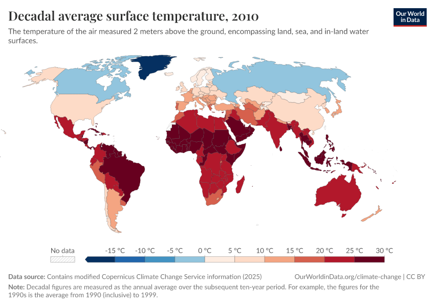 “Data Page: Decadal average surface temperature”, part of the following publication: Hannah Ritchie, Pablo Rosado, and Veronika Samborska (2024) - “Climate Change”. Data adapted from Contains modified Copernicus Climate Change Service information. Retrieved from https://data-populationgrowth-discre.owid.pages.dev:8789/20260210-110915/grapher/decadal-average-surface-temperature.html [online resource] (archived on February 10, 2026).How to cite this data