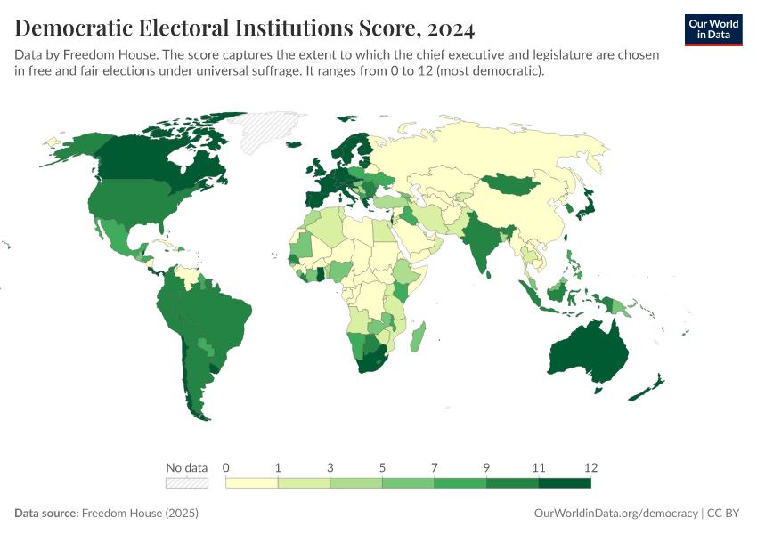 Freedom House (2025) – processed by Our World in Data. “Democratic Electoral Institutions Score” [dataset]. Freedom House, “Freedom in the World” [original data]. Retrieved February 27, 2026 from https://data-populationgrowth-discre.owid.pages.dev:8789/20260204-170225/grapher/democratic-electoral-institutions-fh.html (archived on February 4, 2026).