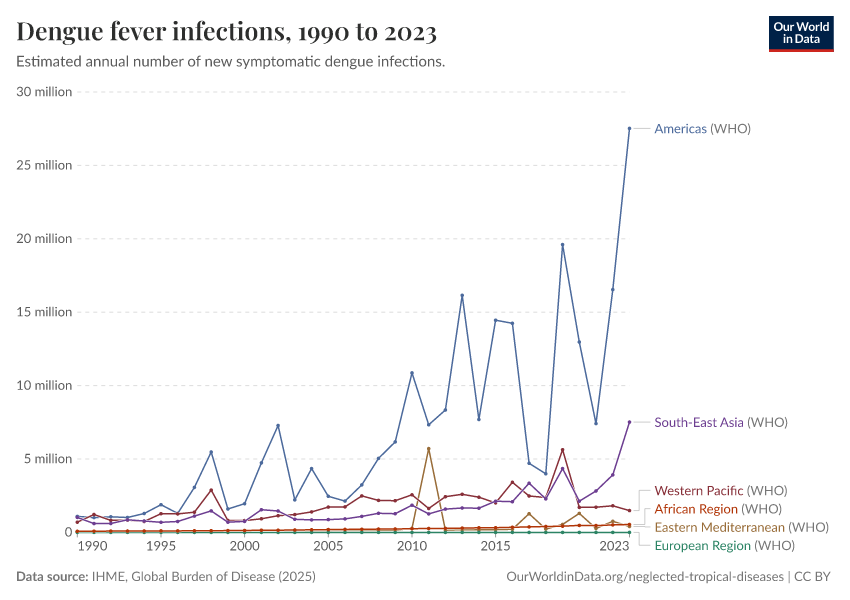 IHME, Global Burden of Disease (2025) – with major processing by Our World in Data. “Dengue fever infections” [dataset]. IHME, Global Burden of Disease, “Global Burden of Disease - Prevalence and Incidence” [original data]. Retrieved February 27, 2026 from https://data-populationgrowth-discre.owid.pages.dev:8789/20260212-172859/grapher/dengue-incidence.html (archived on February 12, 2026).