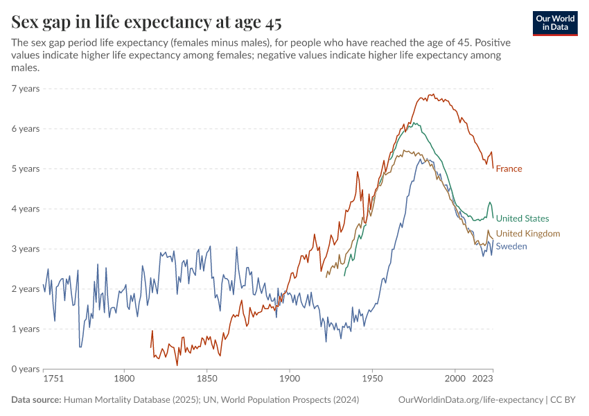 Human Mortality Database (2025); UN, World Population Prospects (2024) – with major processing by Our World in Data. “Life expectancy at 45 – HMD – female-male difference, period tables” [dataset]. Human Mortality Database, “Human Mortality Database”; United Nations, “World Population Prospects” [original data]. Retrieved February 27, 2026 from https://data-populationgrowth-discre.owid.pages.dev:8789/20251022-222946/grapher/difference-in-female-and-male-life-expectancy-at-age-45.html (archived on October 22, 2025).