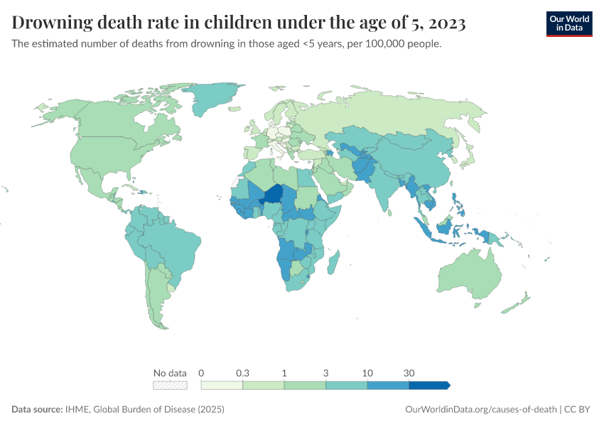 IHME, Global Burden of Disease (2025) – with major processing by Our World in Data. “Drowning death rate in children under the age of 5” [dataset]. IHME, Global Burden of Disease, “Global Burden of Disease - Deaths” [original data]. Retrieved February 27, 2026 from https://data-populationgrowth-discre.owid.pages.dev:8789/20260211-174736/grapher/drowning-death-rates-under-5.html (archived on February 11, 2026).