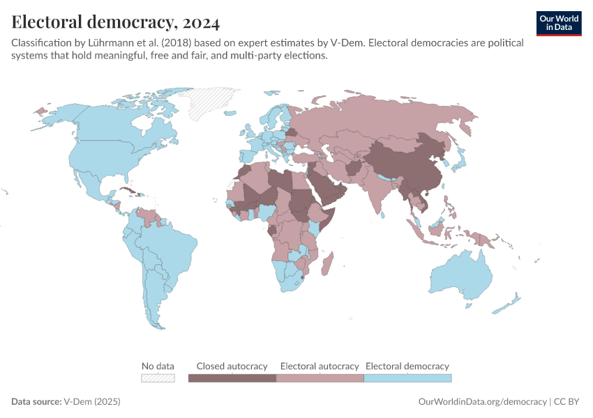 “Data Page: Political regime”, part of the following publication: Bastian Herre, Lucas Rodés-Guirao, and Esteban Ortiz-Ospina (2013) - “Democracy”. Data adapted from V-Dem. Retrieved from https://data-populationgrowth-discre.owid.pages.dev:8789/20260119-070102/grapher/electoral-democracy-row.html [online resource] (archived on January 19, 2026).How to cite this data