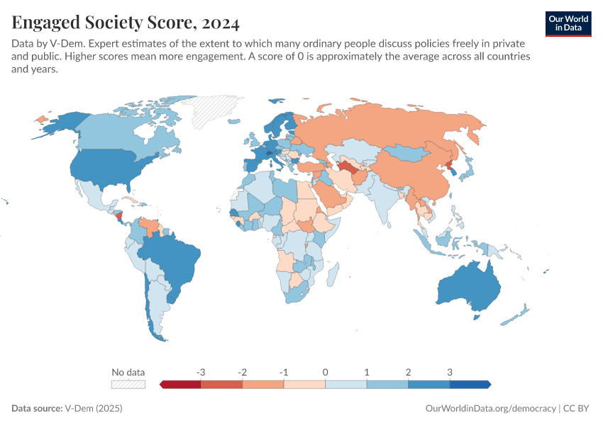 “Data Page: Engaged society”, part of the following publication: Bastian Herre, Lucas Rodés-Guirao, and Esteban Ortiz-Ospina (2013) - “Democracy”. Data adapted from V-Dem. Retrieved from https://data-populationgrowth-discre.owid.pages.dev:8789/20260204-170225/grapher/engaged-society-score.html [online resource] (archived on February 4, 2026).How to cite this data