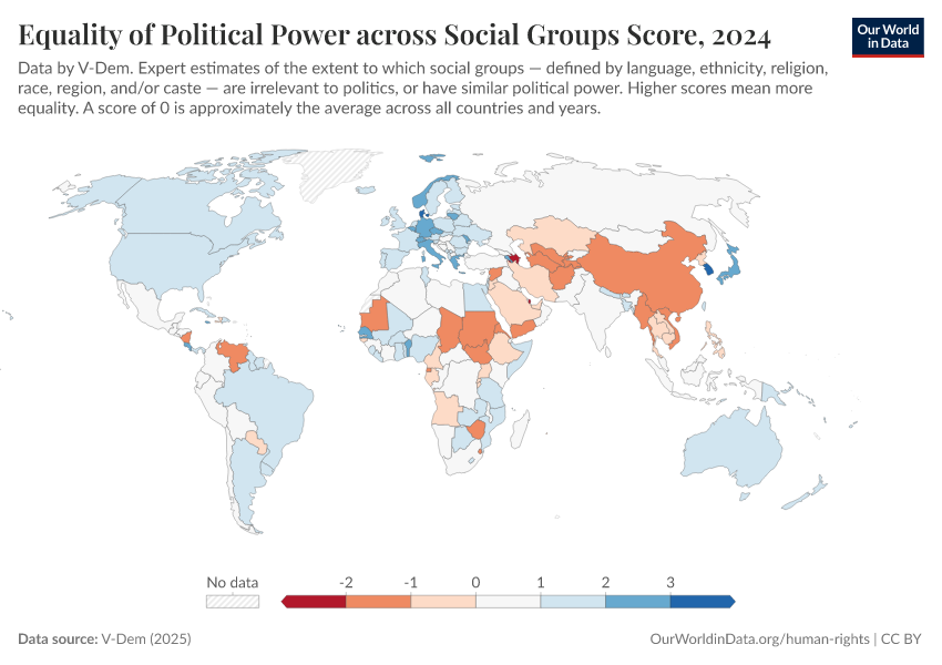 “Data Page: Equality of political power across social groups”, part of the following publication: Bastian Herre, Lucas Rodés-Guirao, and Esteban Ortiz-Ospina (2013) - “Democracy”. Data adapted from V-Dem. Retrieved from https://data-populationgrowth-discre.owid.pages.dev:8789/20260204-170225/grapher/equality-of-political-power-across-social-groups-score.html [online resource] (archived on February 4, 2026).How to cite this data