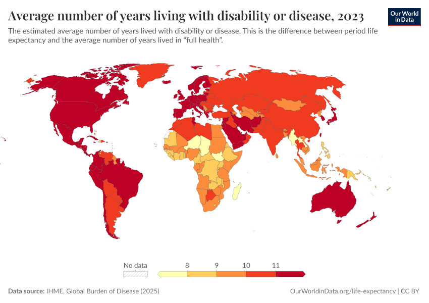 “Data Page: Average number of years living with disability or disease”, part of the following publication: Saloni Dattani, Lucas Rodés-Guirao, Hannah Ritchie, Esteban Ortiz-Ospina, and Max Roser (2023) - “Life Expectancy”. Data adapted from IHME, Global Burden of Disease. Retrieved from https://data-populationgrowth-discre.owid.pages.dev:8789/20260213-171235/grapher/expected-years-of-living-with-disability-or-disease-burden.html [online resource] (archived on February 13, 2026).How to cite this data