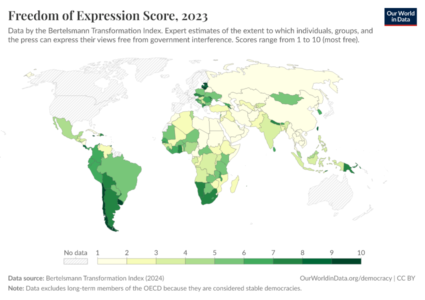 “Data Page: Freedom of Expression Score”, part of the following publication: Bastian Herre, Lucas Rodés-Guirao, and Esteban Ortiz-Ospina (2013) - “Democracy”. Data adapted from Bertelsmann Transformation Index. Retrieved from https://data-populationgrowth-discre.owid.pages.dev:8789/20260204-165456/grapher/freedom-of-expression-score-bti.html [online resource] (archived on February 4, 2026).How to cite this data