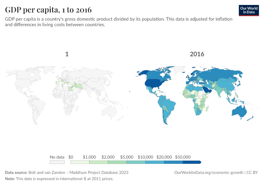 “Data Page: GDP per capita”, part of the following publication: Max Roser, Bertha Rohenkohl, Pablo Arriagada, Joe Hasell, Hannah Ritchie, and Esteban Ortiz-Ospina (2023) - “Economic Growth”. Data adapted from Bolt and van Zanden. Retrieved from https://data-populationgrowth-discre.owid.pages.dev:8789/20251111-144738/grapher/gdp-per-capita-maddison-project-database.html [online resource] (archived on November 11, 2025).How to cite this data