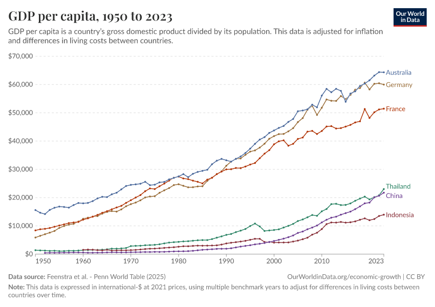 “Data Page: GDP per capita”, part of the following publication: Max Roser, Bertha Rohenkohl, Pablo Arriagada, Joe Hasell, Hannah Ritchie, and Esteban Ortiz-Ospina (2023) - “Economic Growth”. Data adapted from Feenstra et al.. Retrieved from https://data-populationgrowth-discre.owid.pages.dev:8789/20251013-111729/grapher/gdp-per-capita-penn-world-table.html [online resource] (archived on October 13, 2025).