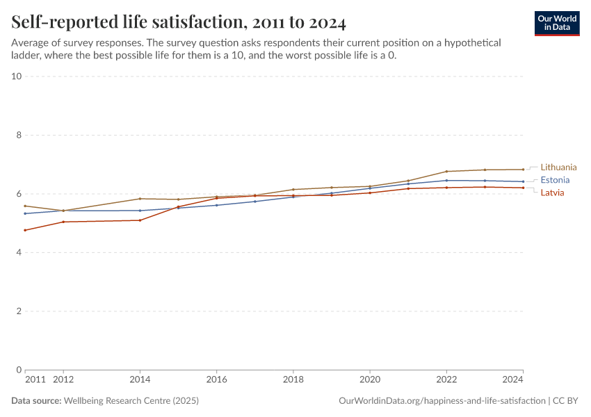 Wellbeing Research Centre (2025) – with major processing by Our World in Data. “Self-reported life satisfaction” [dataset]. Wellbeing Research Centre, “World Happiness Report 2025” [original data]. Retrieved February 27, 2026 from https://data-populationgrowth-discre.owid.pages.dev:8789/20260119-065148/grapher/happiness-cantril-ladder.html (archived on January 19, 2026).