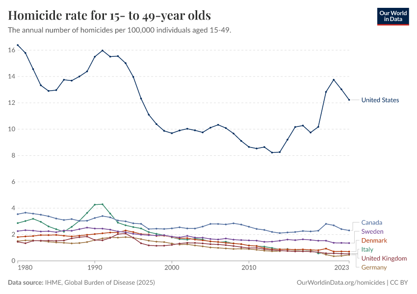 IHME, Global Burden of Disease (2025) – with major processing by Our World in Data. “Homicide rate for 15- to 49-year olds” [dataset]. IHME, Global Burden of Disease, “Global Burden of Disease - Deaths” [original data]. Retrieved February 27, 2026 from https://data-populationgrowth-discre.owid.pages.dev:8789/20260211-174736/grapher/homicide-rate-in-15--to-49-year-olds.html (archived on February 11, 2026).