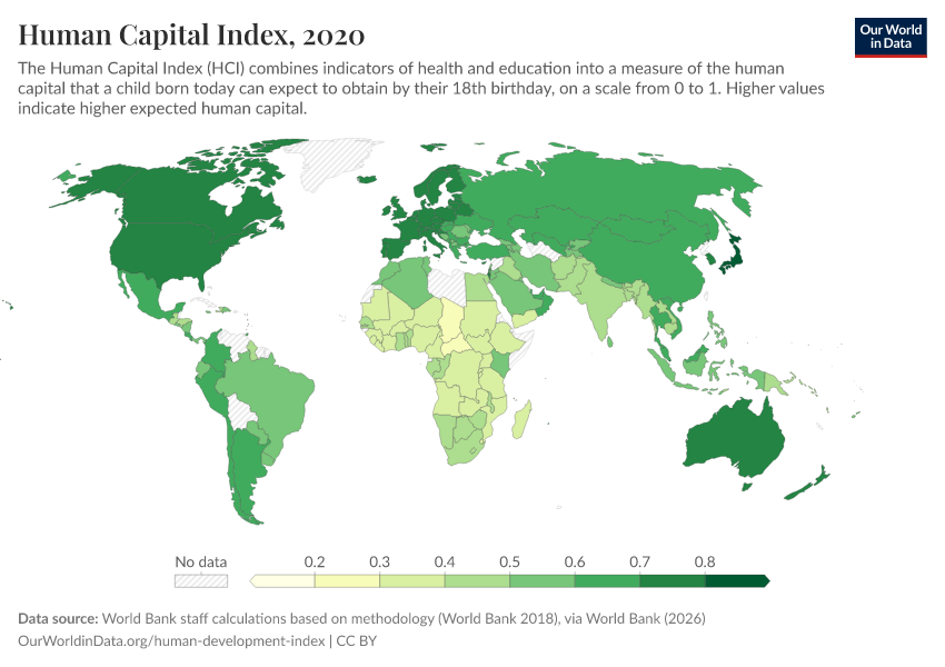 “Data Page: Human Capital Index”. Our World in Data (2026). Data adapted from World Bank staff calculations based on methodology (World Bank 2018), via World Bank. Retrieved from https://data-populationgrowth-discre.owid.pages.dev:8789/20260202-181317/grapher/human-capital-index-in-2018.html [online resource] (archived on February 2, 2026).How to cite this data