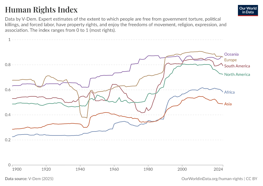 V-Dem (2025) – processed by Our World in Data. “Human rights index – V-Dem” [dataset]. V-Dem, “Democracy report v15” [original data]. Retrieved February 27, 2026 from https://data-populationgrowth-discre.owid.pages.dev:8789/20260119-070102/grapher/human-rights-index-vdem.html (archived on January 19, 2026).