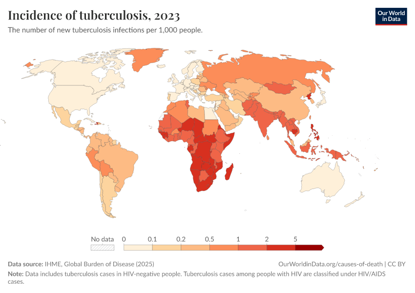IHME, Global Burden of Disease (2025) – with major processing by Our World in Data. “Incidence of tuberculosis” [dataset]. IHME, Global Burden of Disease, “Global Burden of Disease - Prevalence and Incidence” [original data]. Retrieved February 27, 2026 from https://data-populationgrowth-discre.owid.pages.dev:8789/20260212-172859/grapher/incidence-of-tuberculosis.html (archived on February 12, 2026).