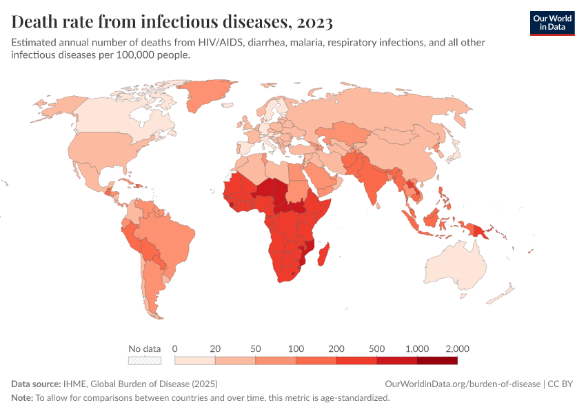 IHME, Global Burden of Disease (2025) – with major processing by Our World in Data. “Death rate from infectious diseases” [dataset]. IHME, Global Burden of Disease, “Global Burden of Disease - Deaths” [original data]. Retrieved February 27, 2026 from https://data-populationgrowth-discre.owid.pages.dev:8789/20260211-174736/grapher/infectious-disease-death-rates.html (archived on February 11, 2026).