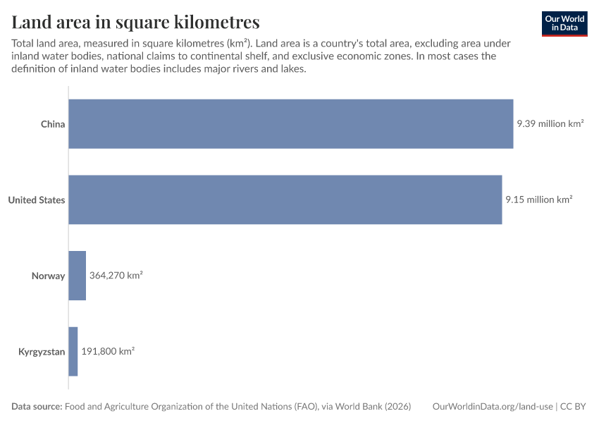 “Data Page: Land area in square kilometres”. Our World in Data (2026). Data adapted from Food and Agriculture Organization of the United Nations (FAO), via World Bank. Retrieved from https://data-populationgrowth-discre.owid.pages.dev:8789/20260202-181317/grapher/land-area-km.html [online resource] (archived on February 2, 2026).