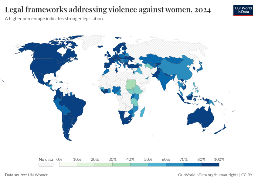 “Data Page: Legal frameworks addressing violence against women”. Our World in Data (2026). Data adapted from UN Women. Retrieved from https://data-populationgrowth-discre.owid.pages.dev:8789/20260130-180113/grapher/legal-frameworks-regarding-violence-against-women.html [online resource] (archived on January 30, 2026).How to cite this data