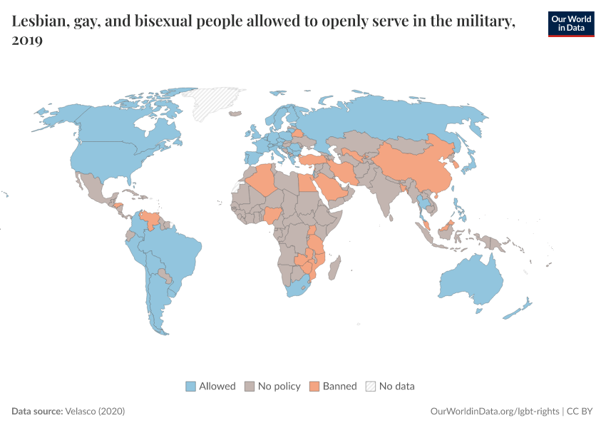 “Data Page: Lesbian, gay, and bisexual people allowed to openly serve in the military”, part of the following publication: Bastian Herre and Pablo Arriagada (2023) - “LGBT+ Rights”. Data adapted from Velasco. Retrieved from https://data-populationgrowth-discre.owid.pages.dev:8789/20251023-195030/grapher/lgb-military-velasco.html [online resource] (archived on October 23, 2025).How to cite this data