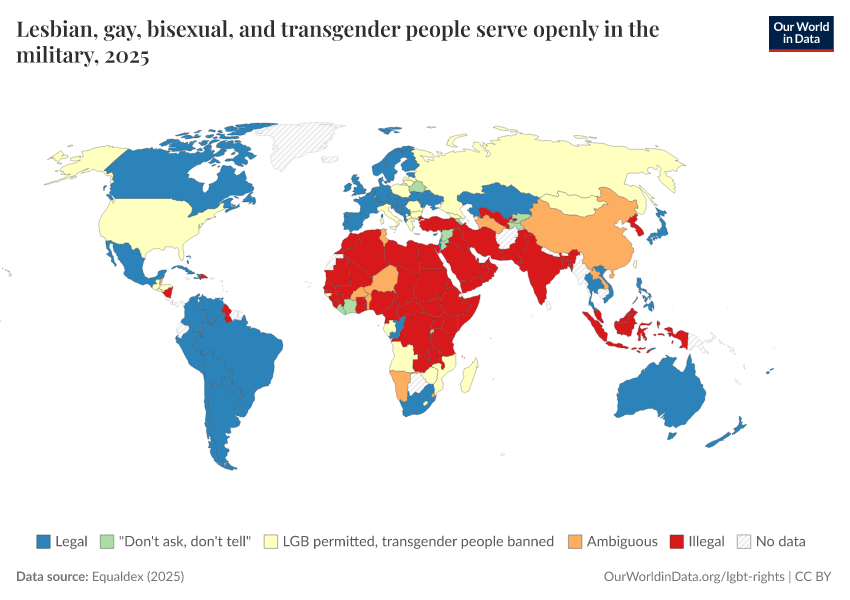 “Data Page: Lesbian, gay, bisexual, and transgender people serve openly in the military”, part of the following publication: Bastian Herre and Pablo Arriagada (2023) - “LGBT+ Rights”. Data adapted from Equaldex. Retrieved from https://data-populationgrowth-discre.owid.pages.dev:8789/20250909-093708/grapher/lgbt-military-equaldex.html [online resource] (archived on September 9, 2025).How to cite this data