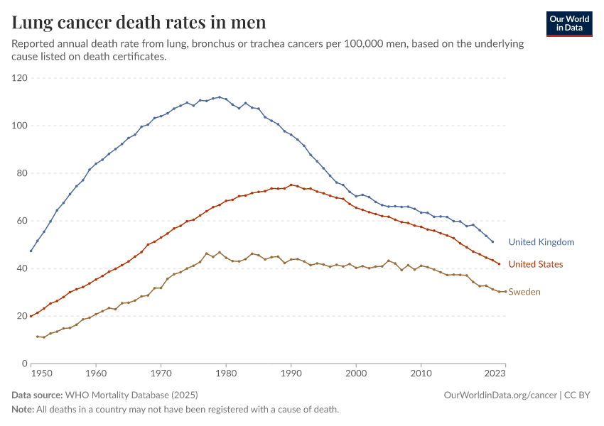 “Data Page: Lung cancer death rates in men”, part of the following publication: Saloni Dattani, Fiona Spooner, Hannah Ritchie, and Max Roser (2023) - “Causes of Death”. Data adapted from WHO Mortality Database. Retrieved from https://data-populationgrowth-discre.owid.pages.dev:8789/20250909-093708/grapher/lung-cancer-death-rates-males.html [online resource] (archived on September 9, 2025).How to cite this data
