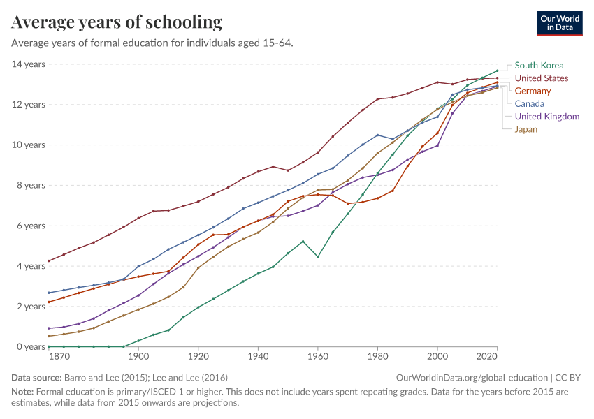 Barro and Lee (2015); Lee and Lee (2016) – with major processing by Our World in Data. “Average years of schooling” [dataset]. Barro and Lee, “Projections of Educational Attainment”; Lee and Lee, “Human Capital in the Long Run” [original data]. Retrieved February 27, 2026 from https://data-populationgrowth-discre.owid.pages.dev:8789/20260119-070102/grapher/mean-years-of-schooling-long-run.html (archived on January 19, 2026).
