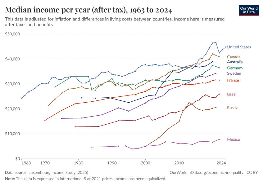“Data Page: Median income per year (after tax)”, part of the following publication: Joe Hasell, Bertha Rohenkohl, Pablo Arriagada, Esteban Ortiz-Ospina, and Max Roser (2022) - “Poverty”. Data adapted from Luxembourg Income Study. Retrieved from https://data-populationgrowth-discre.owid.pages.dev:8789/20251224-105916/grapher/median-income-after-tax-lis.html [online resource] (archived on December 24, 2025).How to cite this data