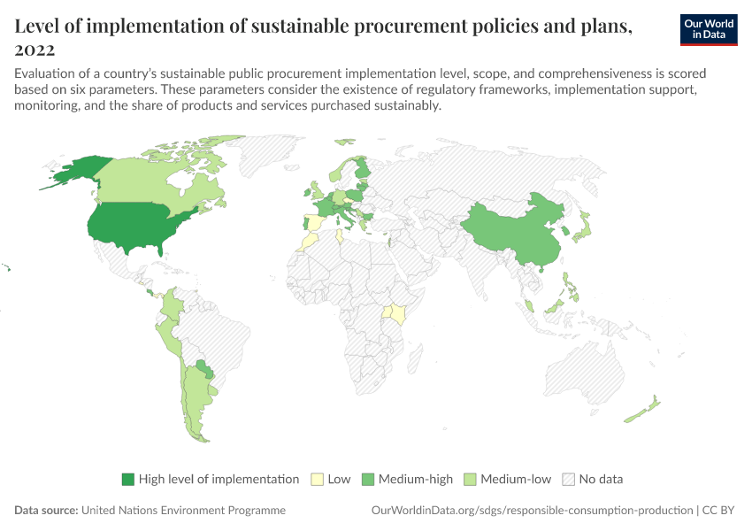“Data Page: Level of implementation of sustainable procurement policies and plans”. Our World in Data (2026). Data adapted from United Nations Environment Programme. Retrieved from https://data-populationgrowth-discre.owid.pages.dev:8789/20251120-211749/grapher/medium-high-level-implementation-of-sustainable-public-procurement.html [online resource] (archived on November 20, 2025).How to cite this data
