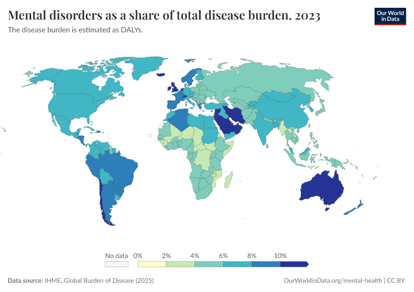 “Data Page: Mental disorders as a share of total disease burden”, part of the following publication: Esteban Ortiz-Ospina and Max Roser (2016) - “Global Health”. Data adapted from IHME, Global Burden of Disease. Retrieved from https://data-populationgrowth-discre.owid.pages.dev:8789/20260211-174736/grapher/mental-and-substance-use-as-share-of-disease.html [online resource] (archived on February 11, 2026).How to cite this data