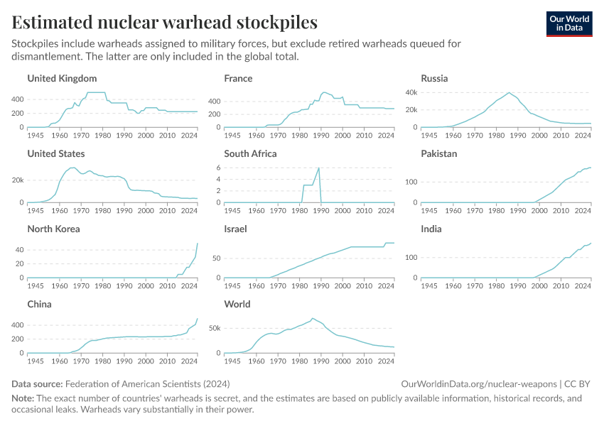 Federation of American Scientists (2024) – with minor processing by Our World in Data. “Estimated nuclear warhead stockpiles” [dataset]. Federation of American Scientists, “Estimated Global Nuclear Warhead Inventories” [original data]. Retrieved February 27, 2026 from https://data-populationgrowth-discre.owid.pages.dev:8789/20250909-093708/grapher/nuclear-warhead-stockpiles-lines.html (archived on September 9, 2025).