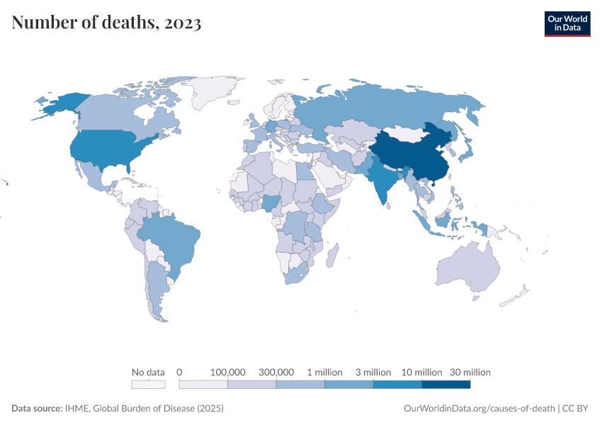 “Data Page: Number of deaths”, part of the following publication: Esteban Ortiz-Ospina and Max Roser (2016) - “Global Health”. Data adapted from IHME, Global Burden of Disease. Retrieved from https://data-populationgrowth-discre.owid.pages.dev:8789/20260211-174736/grapher/number-of-deaths-gbd.html [online resource] (archived on February 11, 2026).How to cite this data
