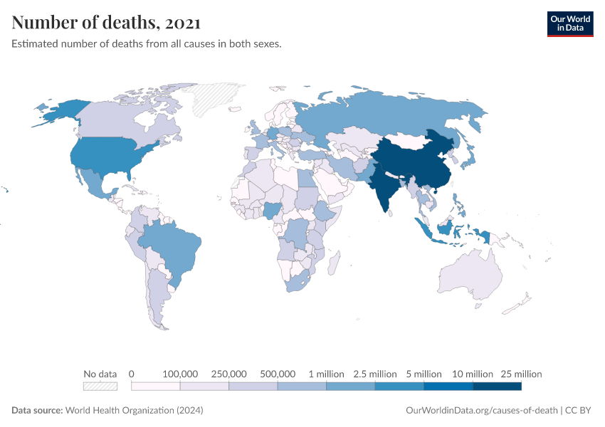 “Data Page: Number of deaths”, part of the following publication: Esteban Ortiz-Ospina and Max Roser (2016) - “Global Health”. Data adapted from World Health Organization. Retrieved from https://data-populationgrowth-discre.owid.pages.dev:8789/20250909-093708/grapher/number-of-deaths-who.html [online resource] (archived on September 9, 2025).How to cite this data