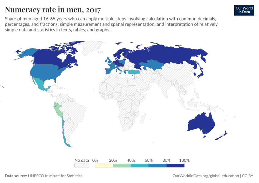 “Data Page: Numeracy rate in men”. Our World in Data (2026). Data adapted from UNESCO Institute for Statistics. Retrieved from https://data-populationgrowth-discre.owid.pages.dev:8789/20251120-211749/grapher/numeracy-rate-in-adult-men.html [online resource] (archived on November 20, 2025).How to cite this data
