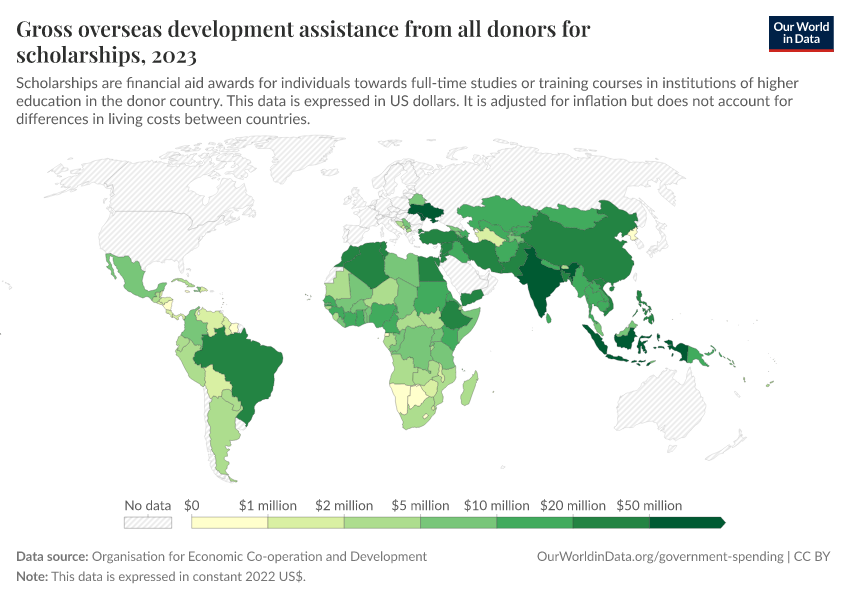 “Data Page: Gross overseas development assistance from all donors for scholarships”. Our World in Data (2026). Data adapted from Organisation for Economic Co-operation and Development. Retrieved from https://data-populationgrowth-discre.owid.pages.dev:8789/20260130-180113/grapher/oda-for-scholarships.html [online resource] (archived on January 30, 2026).How to cite this data