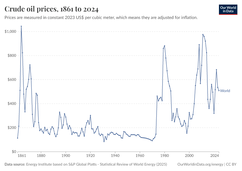 “Data Page: Oil price - Crude prices since 1861”, part of the following publication: Hannah Ritchie, Pablo Rosado, and Max Roser (2023) - “Energy”. Data adapted from Energy Institute. Retrieved from https://data-populationgrowth-discre.owid.pages.dev:8789/20250909-093708/grapher/oil-prices-inflation-adjusted.html [online resource] (archived on September 9, 2025).How to cite this data