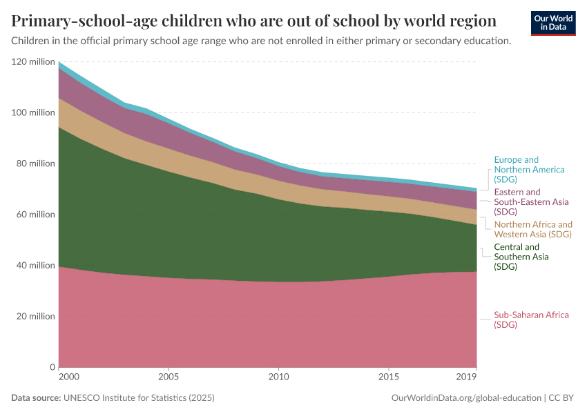“Data Page: Out-of-school children of primary school age”, part of the following publication: Hannah Ritchie, Veronika Samborska, Esteban Ortiz-Ospina, and Max Roser (2023) - “Global Education”. Data adapted from UNESCO Institute for Statistics. Retrieved from https://data-populationgrowth-discre.owid.pages.dev:8789/20260122-091445/grapher/out-of-school-children-of-primary-school-age-by-world-region.html [online resource] (archived on January 22, 2026).How to cite this data