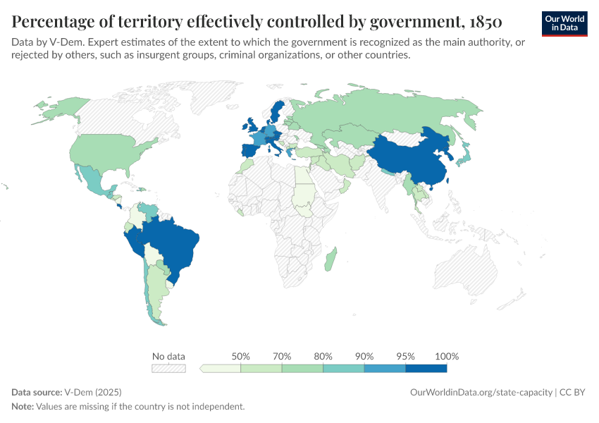 “Data Page: Territory under state control”, part of the following publication: Bastian Herre, Lucas Rodés-Guirao, and Esteban Ortiz-Ospina (2013) - “Democracy”. Data adapted from V-Dem. Retrieved from https://data-populationgrowth-discre.owid.pages.dev:8789/20260119-070102/grapher/percentage-of-territory-controlled-by-government.html [online resource] (archived on January 19, 2026).How to cite this data