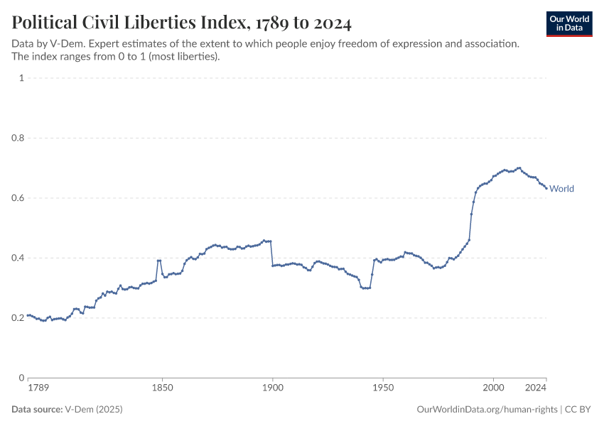 V-Dem (2025) – processed by Our World in Data. “Political civil liberties index – V-Dem” [dataset]. V-Dem, “Democracy report v15” [original data]. Retrieved February 27, 2026 from https://data-populationgrowth-discre.owid.pages.dev:8789/20260119-070102/grapher/political-civil-liberties-index.html (archived on January 19, 2026).