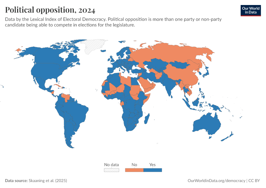 Skaaning et al. (2025) – processed by Our World in Data. “Political opposition” [dataset]. Skaaning et al., “Lexical Index of Electoral Democracy (LIED) v6.8” [original data]. Retrieved February 27, 2026 from https://data-populationgrowth-discre.owid.pages.dev:8789/20260119-065148/grapher/political-opposition-lexical.html (archived on January 19, 2026).