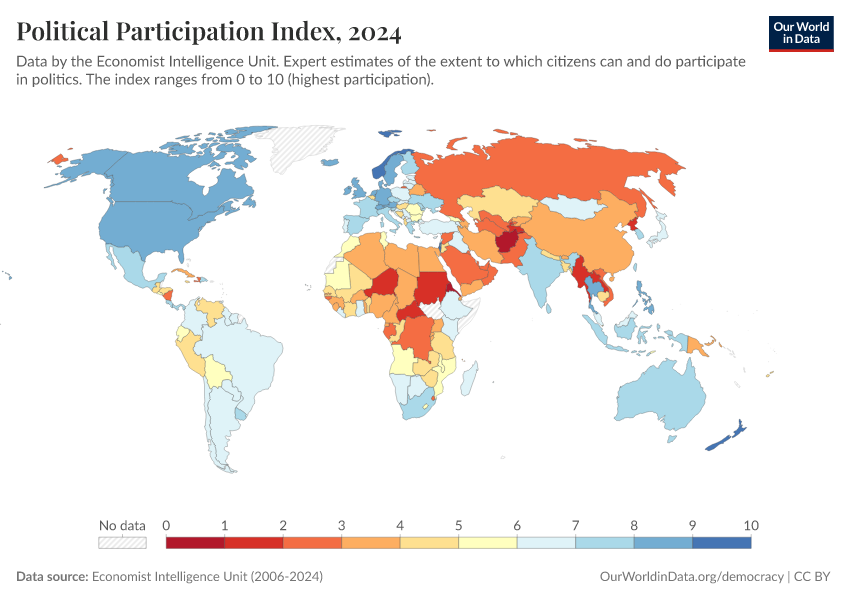 “Data Page: Political Participation Index”, part of the following publication: Bastian Herre, Lucas Rodés-Guirao, and Esteban Ortiz-Ospina (2013) - “Democracy”. Data adapted from Economist Intelligence Unit, Gapminder, Various sources. Retrieved from https://data-populationgrowth-discre.owid.pages.dev:8789/20260119-070102/grapher/political-participation-index-eiu.html [online resource] (archived on January 19, 2026).How to cite this data