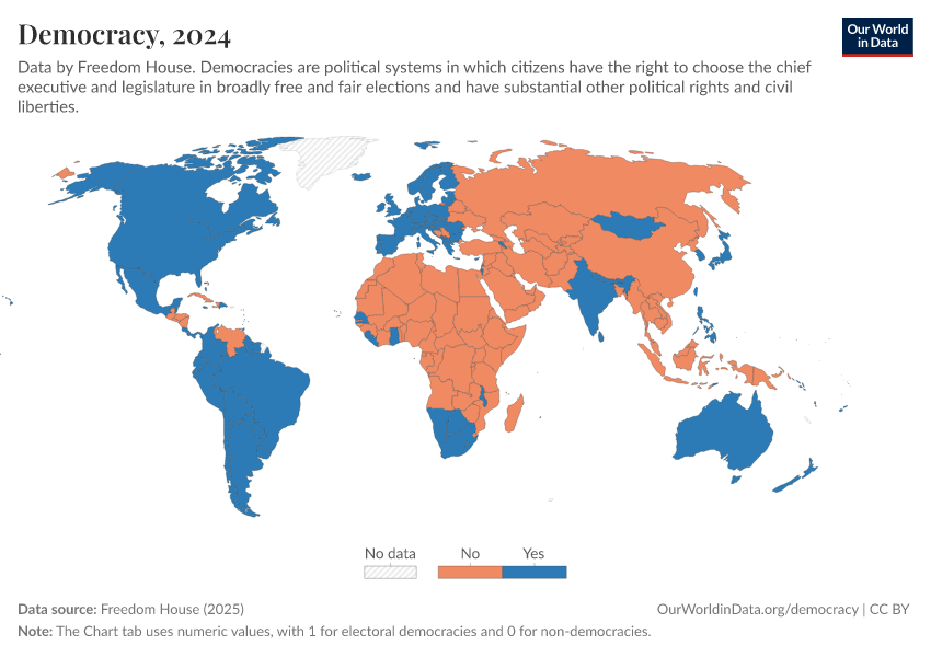 Freedom House (2025) – processed by Our World in Data. “Democracy” [dataset]. Freedom House, “Freedom in the World” [original data]. Retrieved February 27, 2026 from https://data-populationgrowth-discre.owid.pages.dev:8789/20260119-070102/grapher/political-regime-dem-fh.html (archived on January 19, 2026).