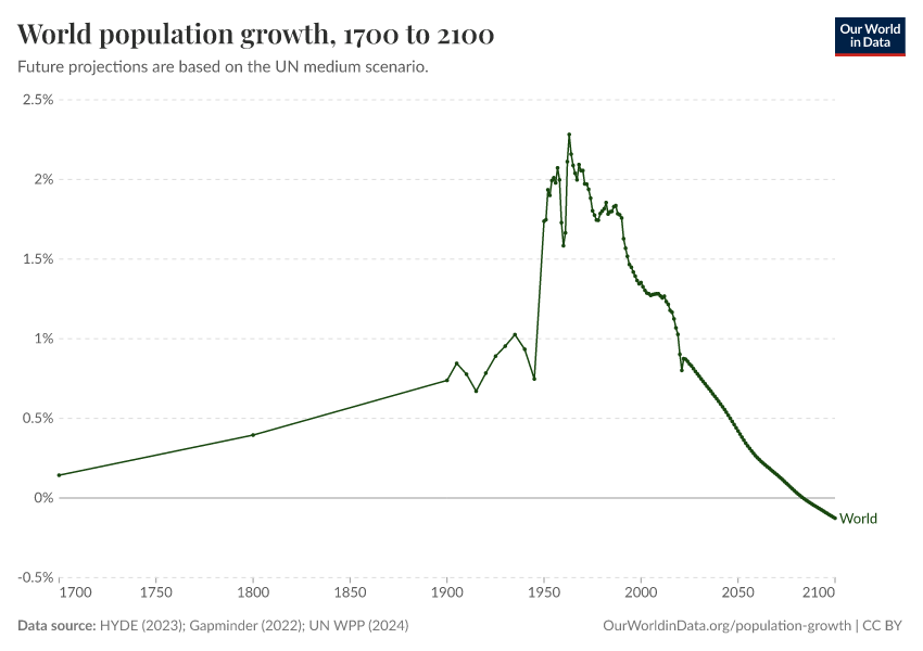 “Data Page: World population growth”, part of the following publication: Hannah Ritchie, Lucas Rodés-Guirao, Edouard Mathieu, Marcel Gerber, Esteban Ortiz-Ospina, Joe Hasell, and Max Roser (2023) - “Population Growth”. Data adapted from PBL Netherlands Environmental Assessment Agency, Gapminder, United Nations. Retrieved from https://data-populationgrowth-discre.owid.pages.dev:8789/20260223-142202/grapher/population-growth-rate.html [online resource] (archived on February 23, 2026).How to cite this data