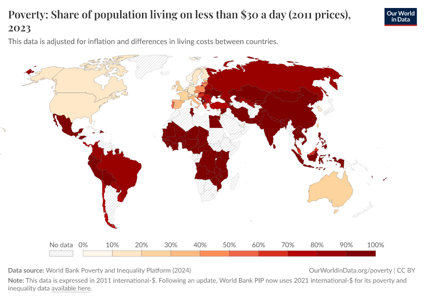World Bank Poverty and Inequality Platform (2024) – with major processing by Our World in Data. “Poverty: Share of population living on less than $30 a day (2011 prices) – World Bank” [dataset]. World Bank Poverty and Inequality Platform, “World Bank Poverty and Inequality Platform (PIP) 20240627_2017, 20240627_2011” [original data]. Retrieved February 27, 2026 from https://data-populationgrowth-discre.owid.pages.dev:8789/20251022-091218/grapher/poverty-share-on-less-than-30-per-day-2011-ppp.html (archived on October 22, 2025).