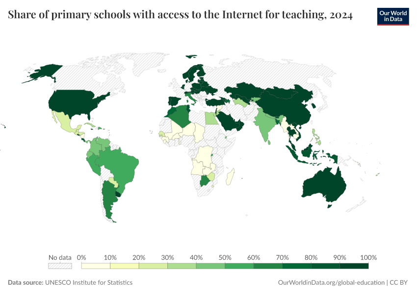 “Data Page: Share of primary schools with access to the Internet for teaching”. Our World in Data (2026). Data adapted from UNESCO Institute for Statistics. Retrieved from https://data-populationgrowth-discre.owid.pages.dev:8789/20260130-180113/grapher/primary-schools-with-access-to-internet.html [online resource] (archived on January 30, 2026).How to cite this data