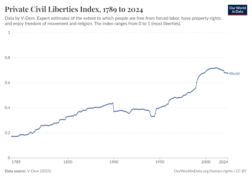 “Data Page: Private civil liberties index”, part of the following publication: Bastian Herre, Lucas Rodés-Guirao, and Esteban Ortiz-Ospina (2013) - “Democracy”. Data adapted from V-Dem. Retrieved from https://data-populationgrowth-discre.owid.pages.dev:8789/20260119-070102/grapher/private-civil-liberties-index.html [online resource] (archived on January 19, 2026).How to cite this data