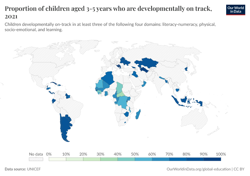 “Data Page: Proportion of children aged 3-5 years who are developmentally on track”. Our World in Data (2026). Data adapted from UNICEF. Retrieved from https://data-populationgrowth-discre.owid.pages.dev:8789/20260105-133053/grapher/proportion-of-children-developmentally-on-track.html [online resource] (archived on January 5, 2026).How to cite this data
